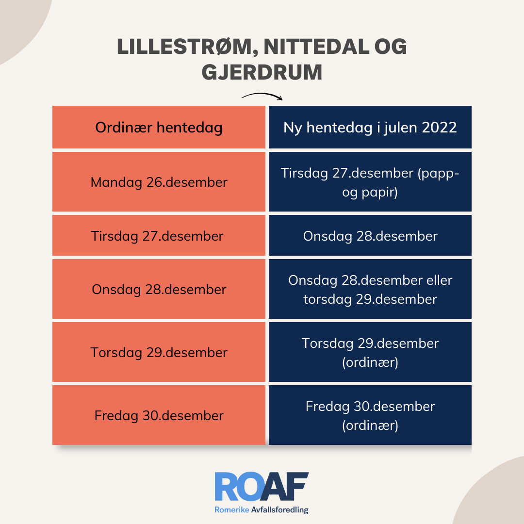 I juleukene er det helligdager hvor vi ikke kan hente avfall. Det betyr at mange av våre innbyggere får endrede hentetider enten i forkant, i romjulen eller i forbindelse med nyttår. Vi ber alle våre kunder om å la avfallsbeholderne stå framme til vi har vært og tømt dem. Vi minner også om endrede åpningstider på våre gjenvinningsstasjoner i julen.