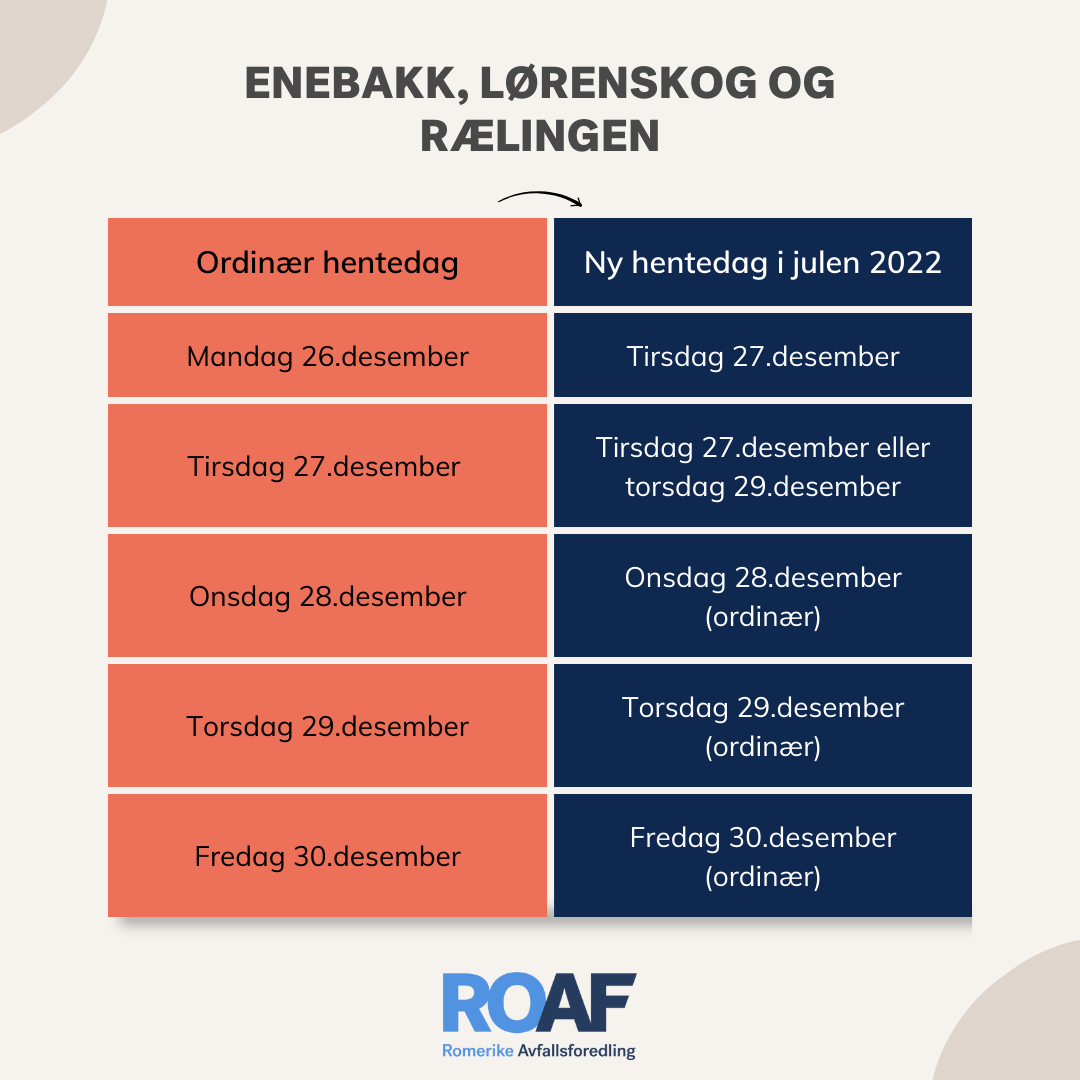 NB! Husk også å måke og strø rundt og foran avfallsbeholderne på hentedagen. slik at våre renovatører klarer å få med seg beholderen. Det må også fjernes snø og is fra topplokk. Det samme gjelder for containere/avfallsbrønner. Det er også viktig å tenke på at renovasjonsbilen kan komme fram når du parkerer bilen i gaten. Etter nyttår går vi tilbake til vanlige dager for tømming. På roaf.no er det alltid oppdaterte tømmetidspunkter. Vi vil bestrebe oss på at avfallsinnhentingen skal foregå så effektivt som mulig, også i julen, og takker for at dere legger til rette, slik at våre renovatører skal få hentet hos alle.