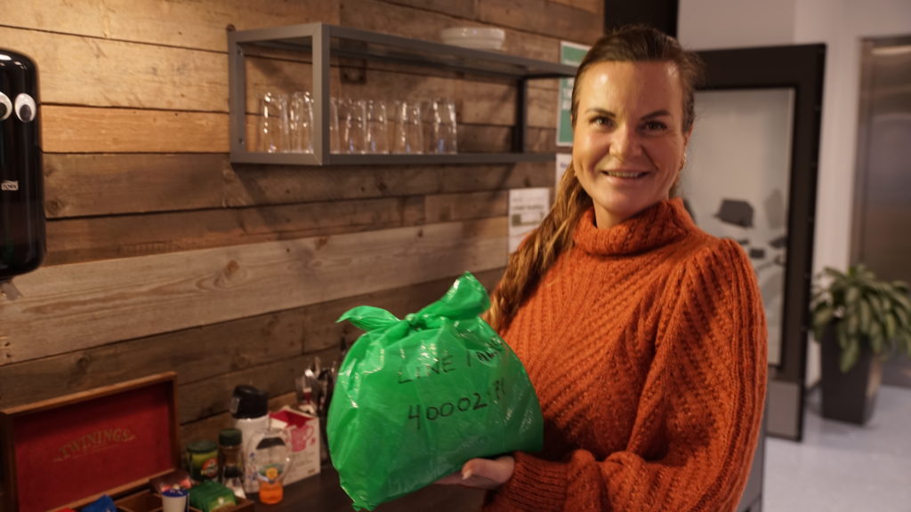 GRØNN POSE: - Hver eneste grønne pose kan bli til et lodd i Poselotteriet, så lenge du sørger for å skrive på navn og nummer med en solid sprittusj, sier Line Malmo i ROAF.