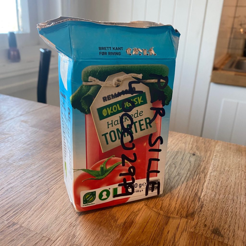 VERDT LIKE MYE: Fra og med januar 2022 har du like store sjanser på storpremien selv om kartongen leveres enkeltvis. Og du kan også delta med denne tomatkartongkameraten. Husk å skrive på navn og telefonnummer med en sprittusj.