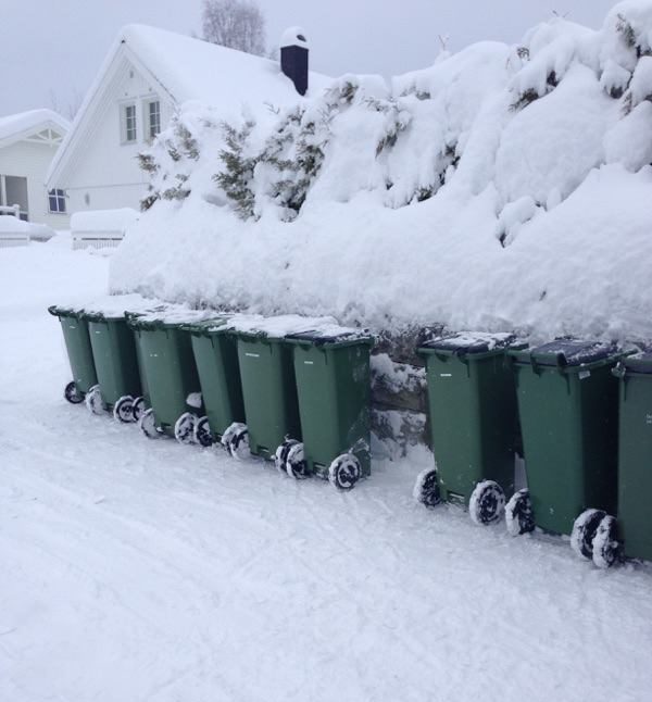Vi har full forståelse for at folk er lei snømåking, men ønsker du at avfallet ditt skal bli hentet, er vi avhengig av at du setter beholderen lett tilgjengelig, måker, fjerner snøen på toppen og på sidene av selve beholderen.