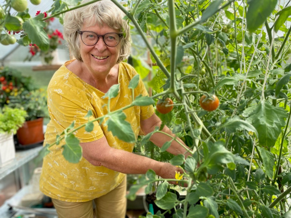 Vinneren av Poselotteriet for juli tar telefonen på første forsøk når vi ringer for å overbringe det glade budskapet. Solveig er for tiden på ferie på Sørlandet, og sønnen stilte opp som fotograf inne i drivhuset: