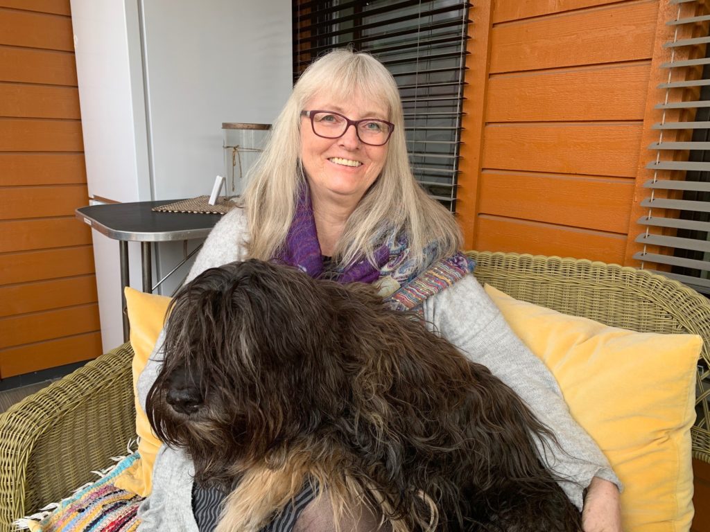 FØRSTE VINNER: Birgit Weigård ble den første vinneren av Poselotteriet, der man kan vinne gavekort fra KIWI. Familiehunden Sli ser ut til å ta det hele med knusende ro. Poselotteriet er foreløpig kun for innbyggere i en ROAF-kommune.