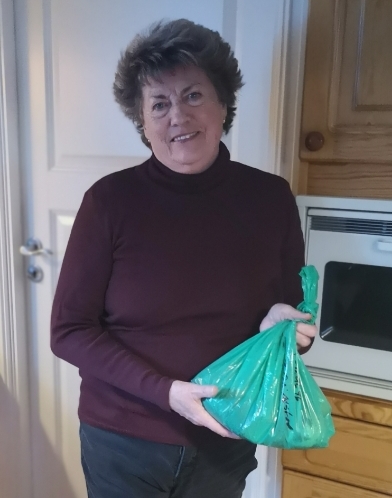 Bjørg har deltatt i lotteriet siden senhøsten, men har sortert matavfall i fra de første grønne posene ble utdelt. Hun forteller videre at de også sorterer annet avfall som bla. emballasje av glass og metall.