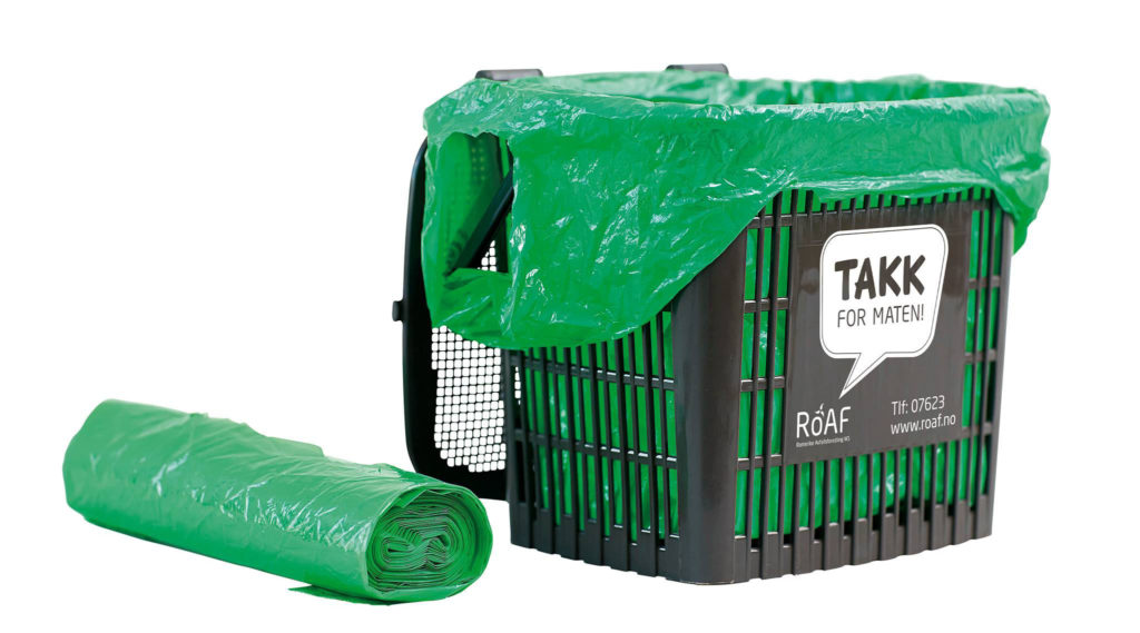 Kurv og grønne poser til matavfall kan du hente på alle ROAFs gjenvinningsstasjoner og på servicetorget i din kommune*.